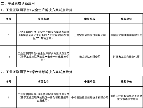 2月18日,工业和信息化部发布“2021年工业互联网试点示范项目名单”,南京钢铁、上海宝信软件、德龙钢铁、河钢数字信达(邯郸)科技、中天钢铁集团、中冶赛迪等企业申报的6个钢铁相关项目入选。详情如下: